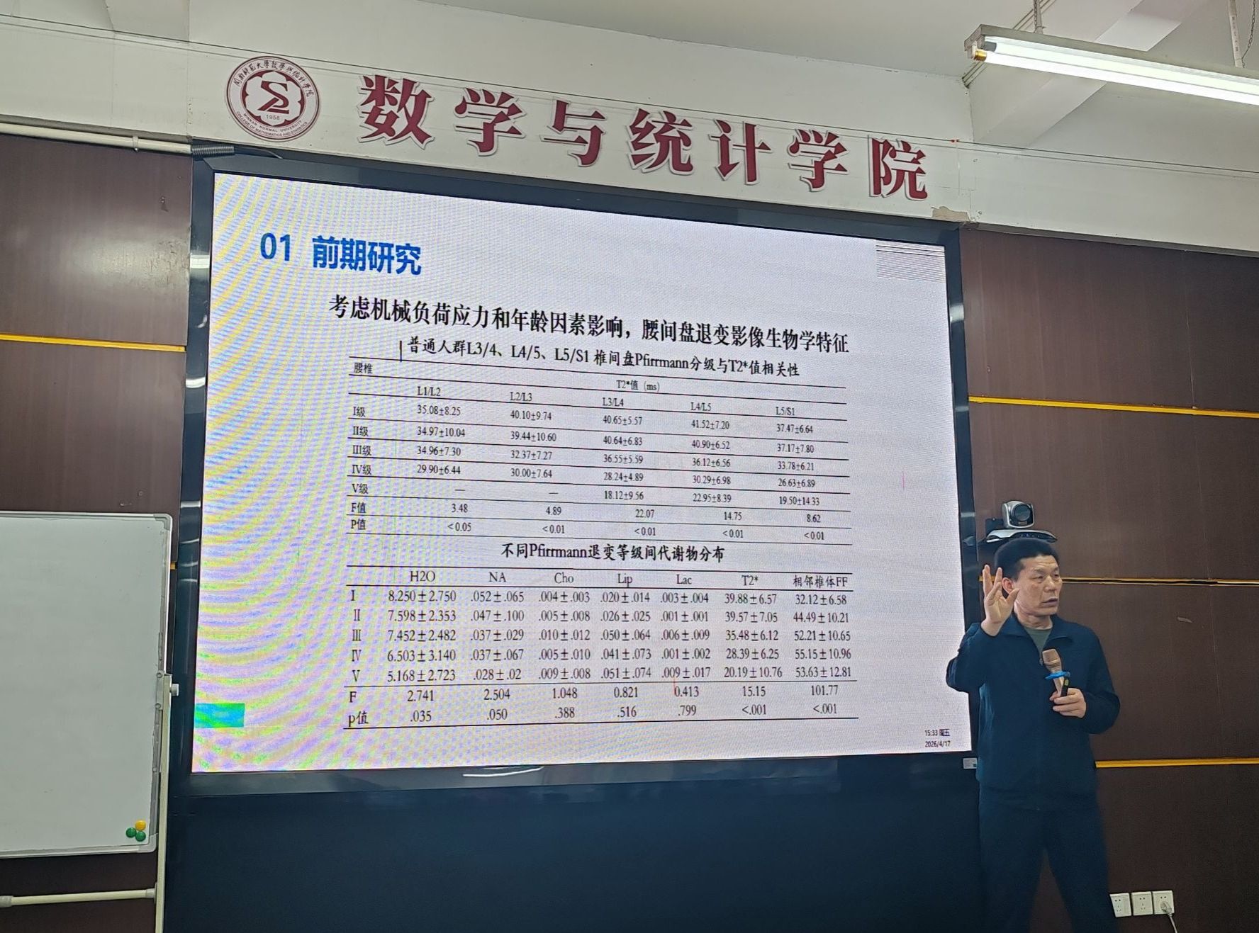 报告中,欧阳林教授围绕“腰膝关节退变衰老研究中的数学统计问题”这一主题,结合腰椎间盘、膝关节等退变性疾病研究中的实际问题,系统介绍了数学、统计方法在医学研究中的重要作用与应用价值。讲座立足临床医学问题导向,围绕腰椎间盘退变、关节退变与衰老机制等研究背景,重点阐释了数学建模、统计分析、多尺度耦合及数据驱动方法在复杂生理病理问题研究中的关键作用。