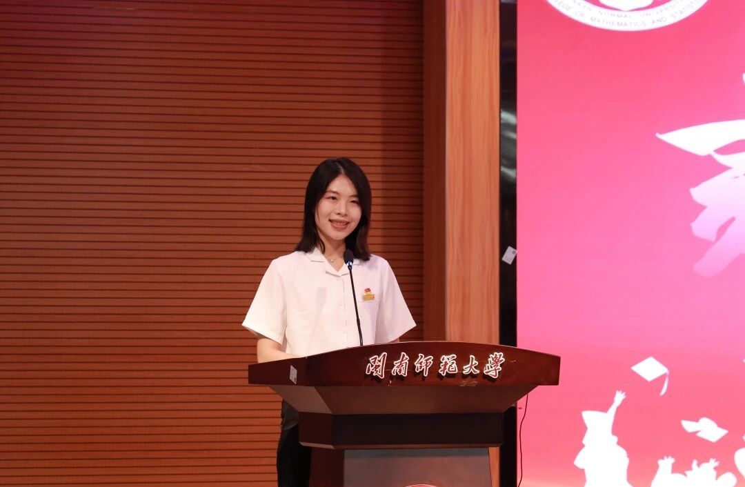 2025级研究生洪雅雯作为新生代表发言。她真挚地分享了初入数统学院的期待与憧憬,感恩来自五湖四海的美好相聚。她表示,愿与全体2025级新生一同在浩瀚数海中追寻真理,在深耕数理中探索未知,用数学谱写青春的隽永篇章。