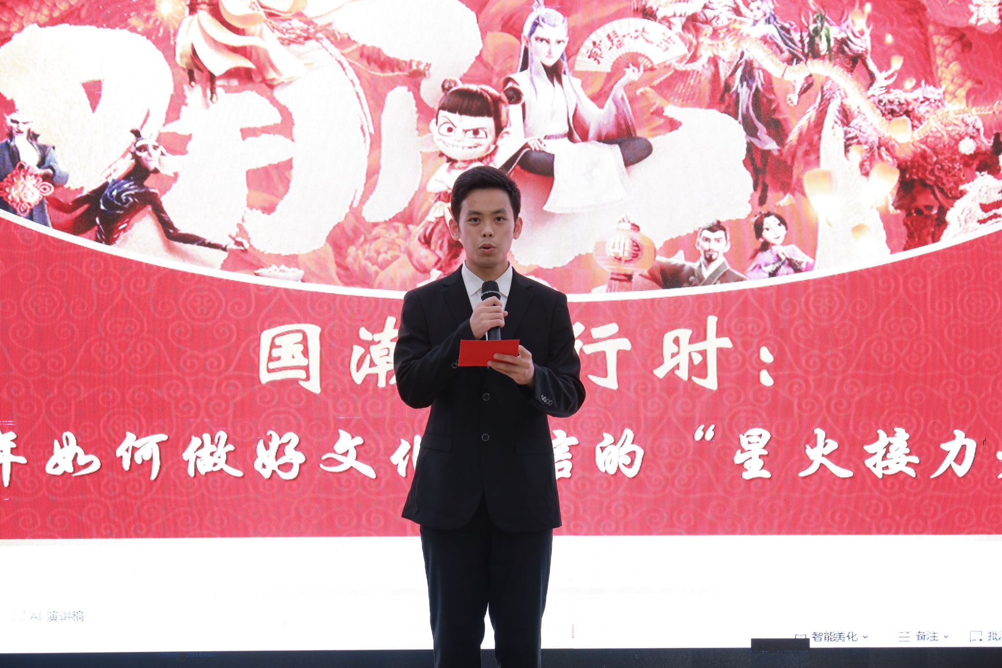讲座尾声,白老师总结道:“国潮是文化自信的外显,青年是创新传承的核心力量。” 她向全体学员发出“三个一”行动倡议:参与一次非遗体验、创作一件国潮作品、传播一个文化故事,鼓励大家真正成为文化的“星火接力者”。