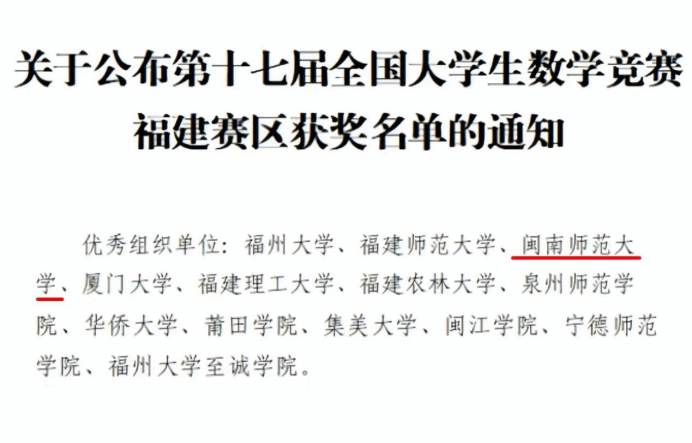 此外,凭借全面的赛事组织、细致的赛前辅导与广泛的动员参与,我校获评第十七届全国大学生数学竞赛福建赛区“优秀组织单位”。该荣誉是福建省数学学会对我院竞赛组织与学科建设工作的充分肯定,也将进一步激励我院相关工作持续提升。